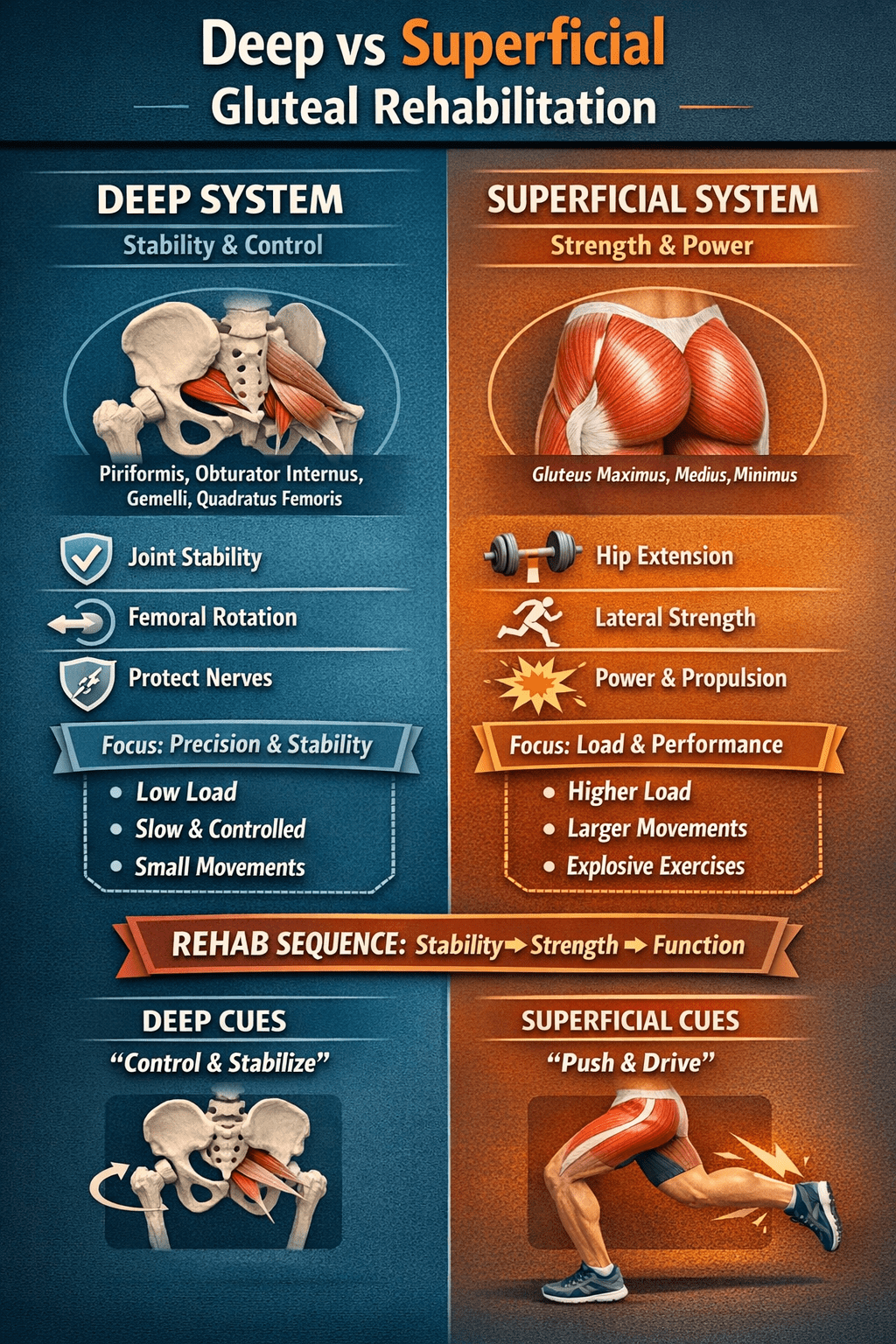 For this reason, effective rehab focuses first on restoring deep glute and adductor control, then gradually reloading the superficial system.